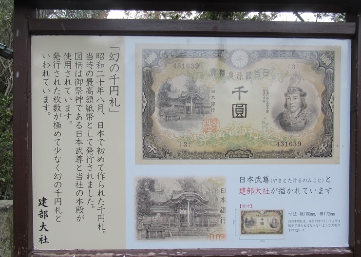 昭和20年に発行された日本発の千円紙幣に、日本武尊と建部大社が描かれています。
