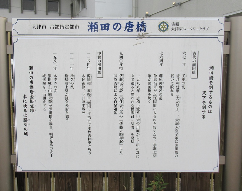 壬申の乱(672年)には近江朝廷軍だった大友皇子が大海人(おおあま)皇子軍に、瀬田橋の戦いで敗れたとの記載が日本書記にあります。